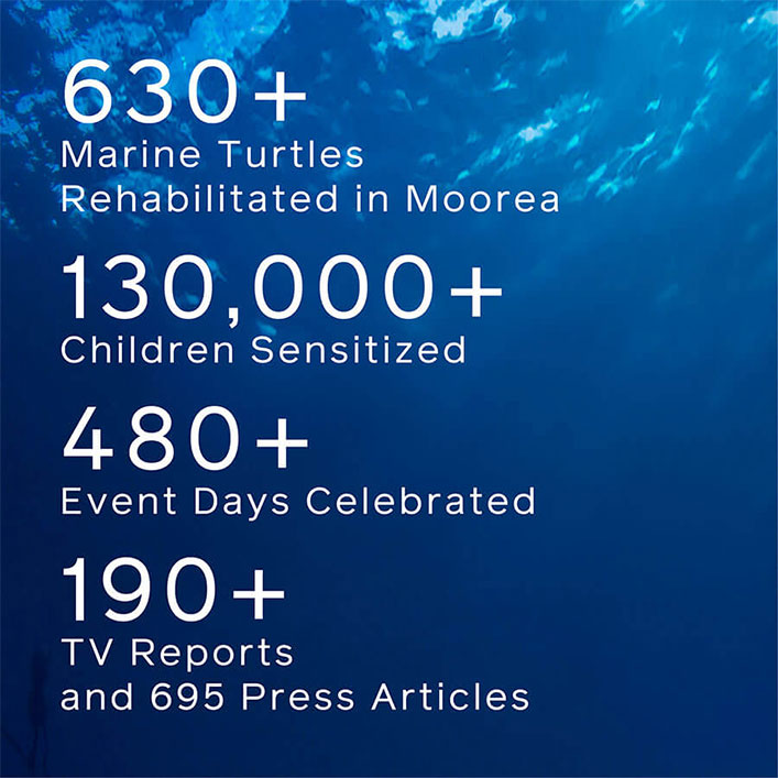Together, we act through different actions: at the care center for sea turtles in Te Mana O Te Moana, we participate in the recovery and release of treated turtles; we contribute to the protection of green turtle nesting sites of the atoll of Tetiaroa, while thus helping to improve the hatching success rate. We support the organization's Hei Moana program, which trains volunteers to collect data in local marine environments in French Polynesia.